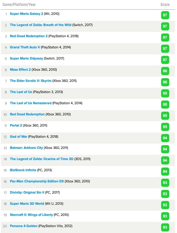 Рейтинг лучших игр формируется на основе различных критериев, таких как графика, сюжет, геймплей, музыка и звуковое сопровождение, а также общее впечатление от игры. Часто рейтинги создаются на основе среднего балла, который выставляют играм критики из различных игровых изданий. Также в рейтинг могут влиять отзывы пользователей, которые оценивают игры по своему личному опыту.
